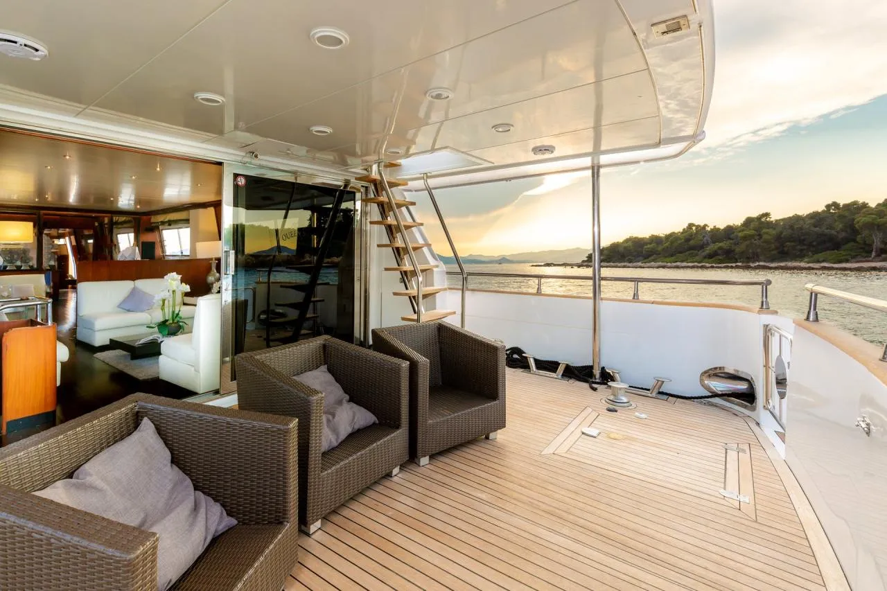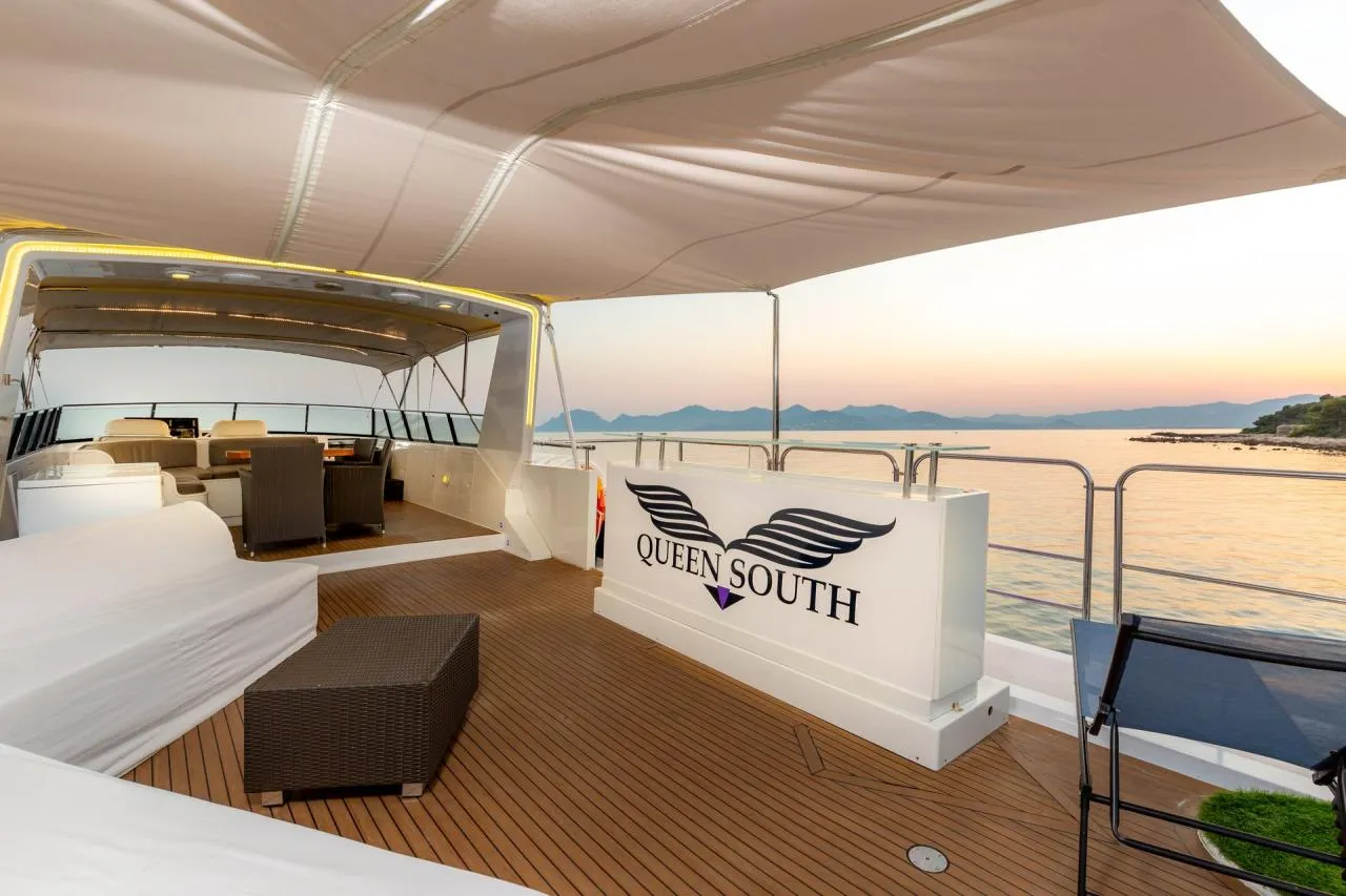 The exterior design of Queen South is characterized by smooth lines and a timeless silhouette. The main aft deck features an alfresco dining area, perfect for enjoying meals with a sea view. The spacious flybridge provides sun loungers and a lounge area, ideal for soaking up the sun or admiring panoramic ocean vistas.