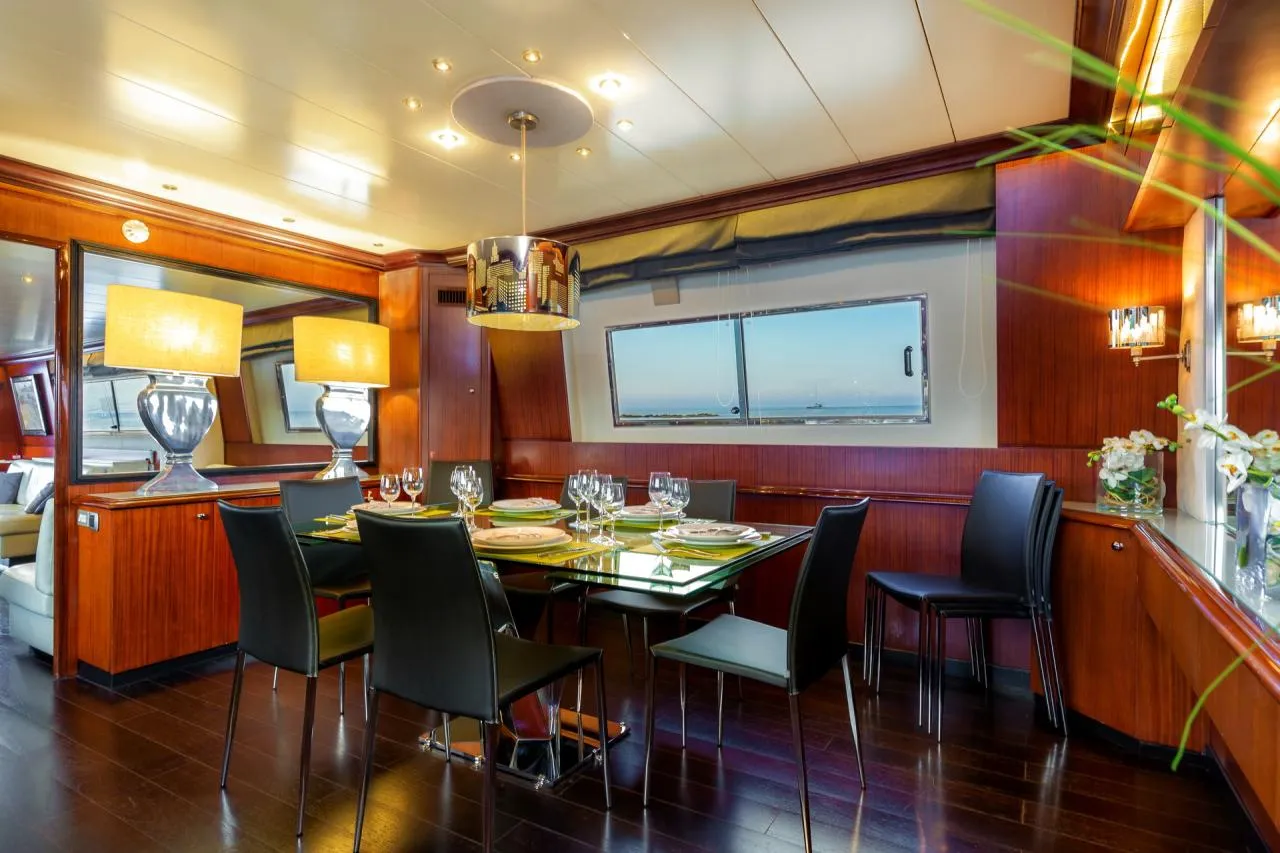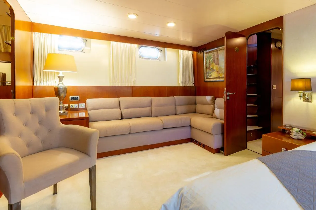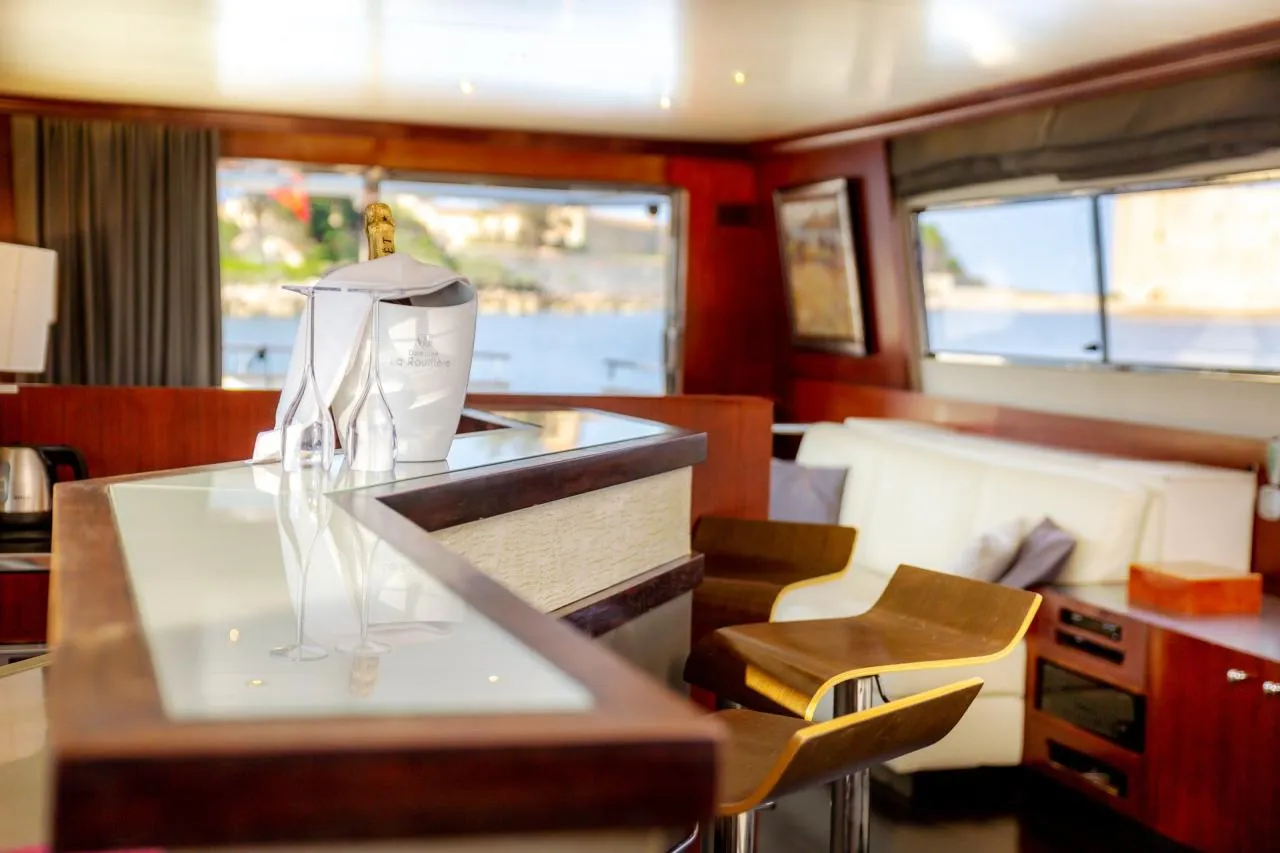 Inside, the yacht boasts a well-thought-out layout and is adorned with quality materials. The main salon is bright and inviting, furnished with plush sofas, a formal dining area, and a modern entertainment system. The fully equipped galley features up-to-date appliances, making it well-suited for extended voyages.