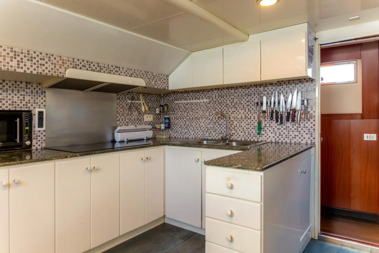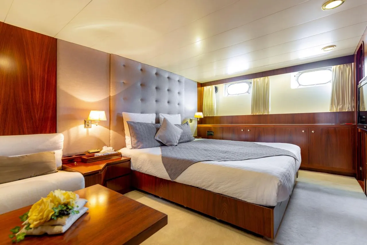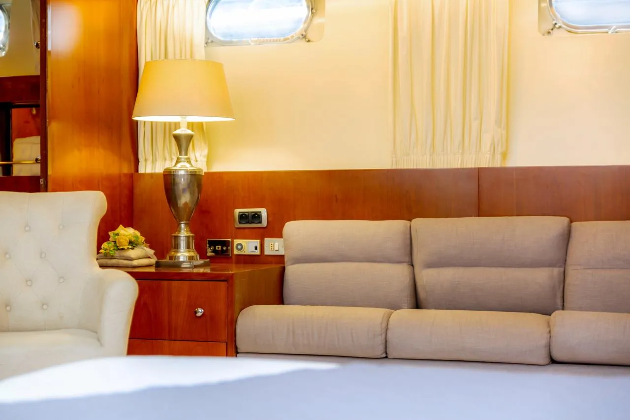 Inside, the yacht boasts a well-thought-out layout and is adorned with quality materials. The main salon is bright and inviting, furnished with plush sofas, a formal dining area, and a modern entertainment system. The fully equipped galley features up-to-date appliances, making it well-suited for extended voyages.