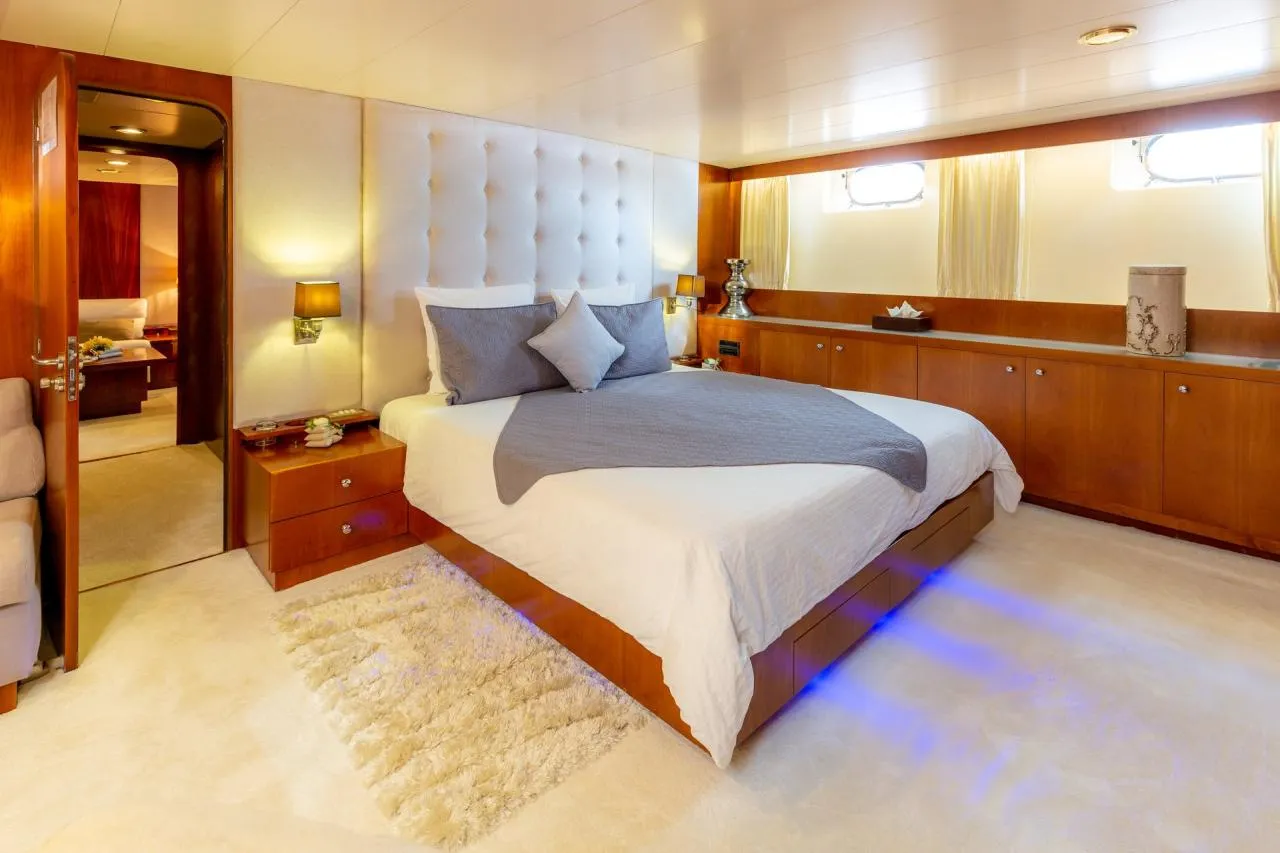 Queen South accommodates up to 8 guests in four comfortable cabins. The full-beam master suite features a king-size bed and a private en-suite bathroom. The remaining cabins include a VIP cabin with a queen-size bed and two twin cabins, each with en-suite facilities, ensuring both privacy and comfort for all guests.